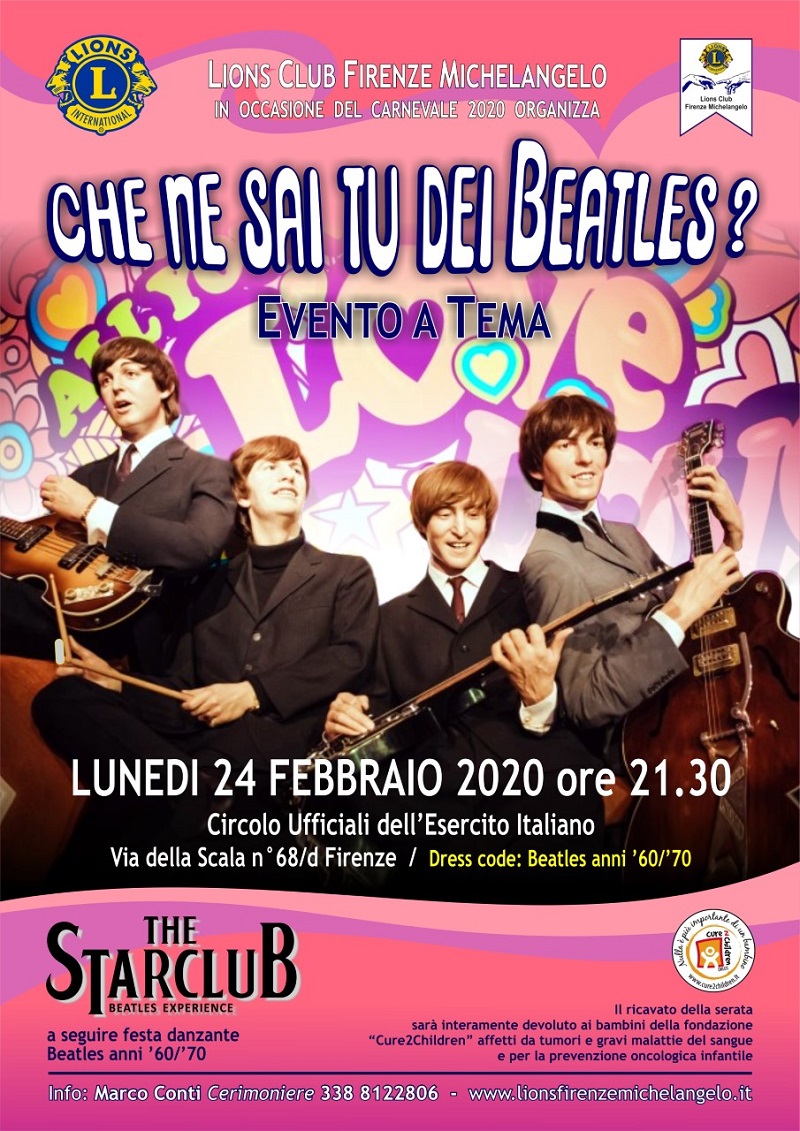 Il Lions Club Firenze Michelangelo in occasione del Carnevale 2020, per il prossimo LUNEDI’ 24 FEBBRAIO 2020 dalle ore 21,30, presso il Circolo Ufficiali dell’Esercito Italiano di Firenze - Via della Scala n° 68/d -, presenterà un concerto, con festa a tema, dal titolo: “CHE NE SAI TU DEI BEATLES?”