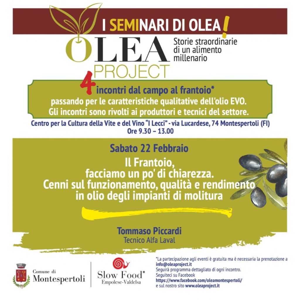 Tornano i seminari di OleaProject: sabato 22 febbraio, ore 9:30, al Centro per la Cultura della Vite e del Vino I Lecci sul tema 'Il Frantoio, facciamo un po' di chiarezza. Cenni sul funzionamento, qualità e rendimento in olio degli impianti di molitura' con Tommaso Piccardi, Tecnico Alfa Laval