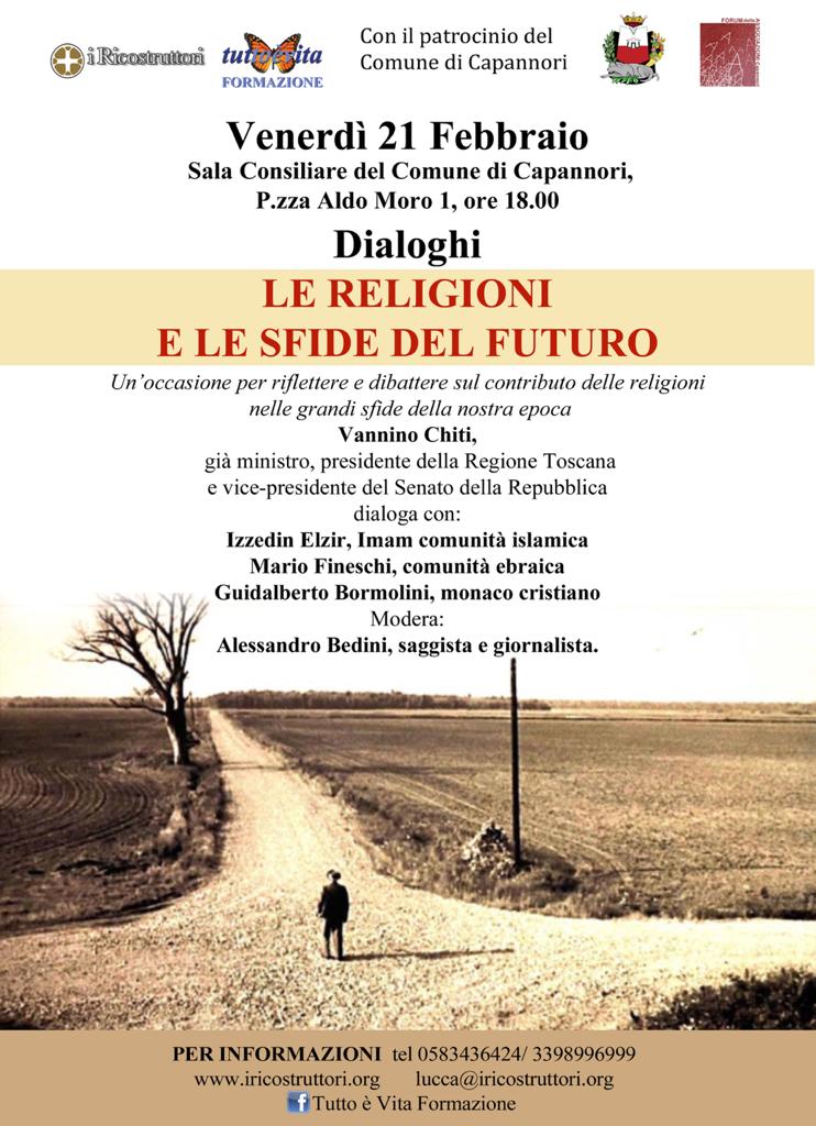 “Le religioni e le sfide del futuro”, l’ultimo libro di Vannino Chiti, sarà presentato venerdì 21 febbraio alle 18 presso la sala consiliare del Comune di Capannori in piazza Aldo Moro 1. L’incontro è promosso dalla Comunità de ‘I Ricostruttori’ in collaborazione con il Comune di Capannori. Assieme all’autore saranno presenti Izzedin Elzir, Imam di Firenze, Mario Fineschi della comunità ebraica, Guidalberto Bormolini, monaco cristiano de ‘I Ricostruttori’. A moderare l’incontro il giornalista e saggista Alessandro Bedini.