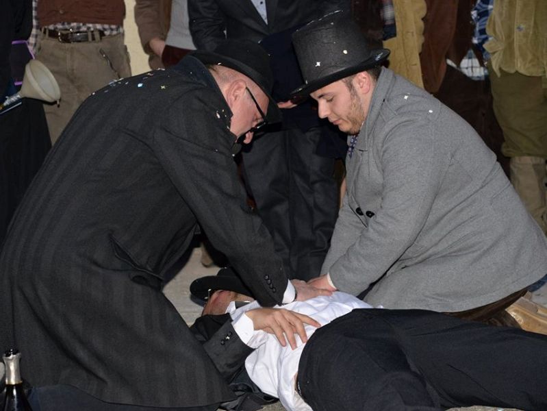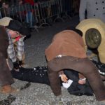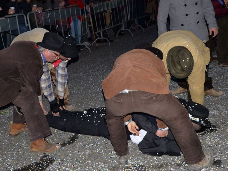 A nulla serve l’intervento del dottore: Carnevale è morto. Da qui la farsa tragicomica tocca il suo punto più alto: l’amico Gaudente si dispera, piange, urla e inizia a cantare “Carnevale non te ne andare”; il prete dà l’estrema unzione e il notaio legge il testamento del Carnevale. Un testamento in cui spesso si fa riferimento ai fatti della vita politica e sociale del paese. Subito dopo inizia il rito del ballo dei gobbi, con i loro grotteschi vestiti, piangono e si disperano intorno al povero Carnevale che, a questo punto, sostituito da un fantoccio, viene adagiato in una bara e portato in giro in una goliardica marcia funebre. Alla fine il fantoccio del Carnevale viene bruciato nella piazza tra la folla in estasi.