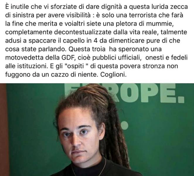 "E' inutile che vi sforziate di dare dignità a questa lurida zecca di sinistra per avere visibilità: è solo una terrorista che farà la fine che merita e voialtri siete una pletora di mummie, completamente decontestualizzate dalla vita reale, talmente adusi a spaccare il capello in 4 da dimenticare pure di che cosa state parlando".