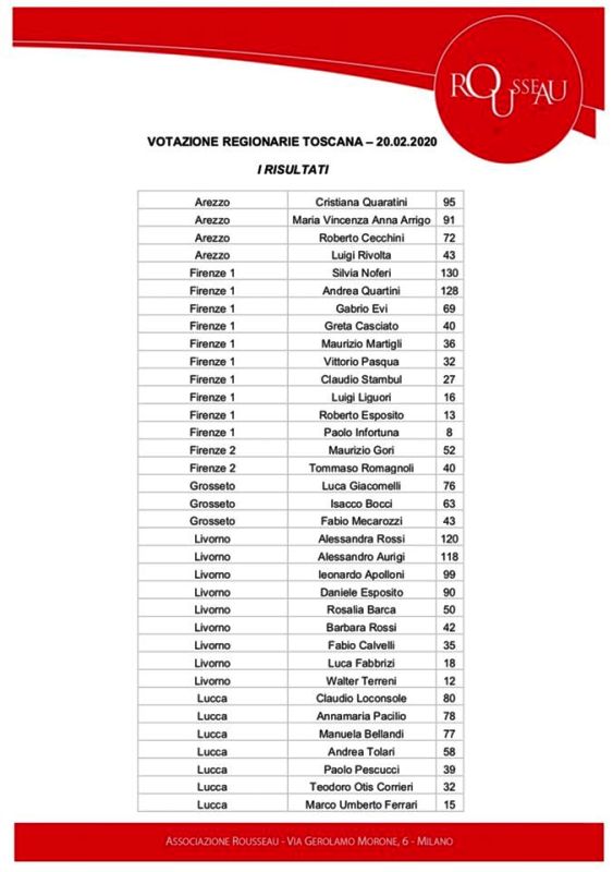 Il Movimento 5 Stelle ha reso noto, attraverso un post sulla sua pagina facebook del capogruppo in Regione, Giacomo Giannarelli, i candidati scelti sulla piattaforma Rousseau dagli iscritti per le prossime elezioni regionali in Toscana. La lista vede a Firenze prima Silvia Noferi seguita da Andrea Quartini, prima ad Arezzo Cristiana Quarantini, mentre a Pisa il più votato è Luca Lauricella, a Prato Chiara Bartalini. A Livorno la capolista è Alessandra Rossi, a Grosseto Luca Giacomelli, a Lucca Claudio Loconsole. Infine capolista a Siena è Maria Pica, a Massa Carrara Elisa Giovannelli, a Pistoia Simone Giovannini, e a Prato Chiara Bartalini. Noferi e Quartini sono risultati i più votati in assoluto con, rispettivamente, 130 e 128 preferenze. In totale sono 54 i candidati M5s votati sulla piattaforma.