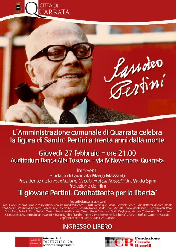 Dopo i saluti istituzionali del Sindaco di Quarrata Marco Mazzanti, è previsto l’intervento di Valdo Spini, Presidente della Fondazione Circolo Fratelli Rosselli. A seguire sarà proiettato il film “Il giovane Pertini. Combattente per la libertà”, per la regia di Giambattista Assanti, prodotto da Genoma Films, in associazione con Kreiamo Production.