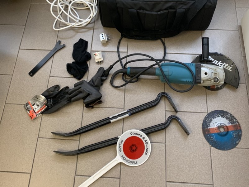 Nel portabagagli la municipale ha trovato oggetti contundenti e da scasso, quali grimaldelli, due piedi di porco e una mola con prolunga elettrica, vari adattatori elettrici e guanti.