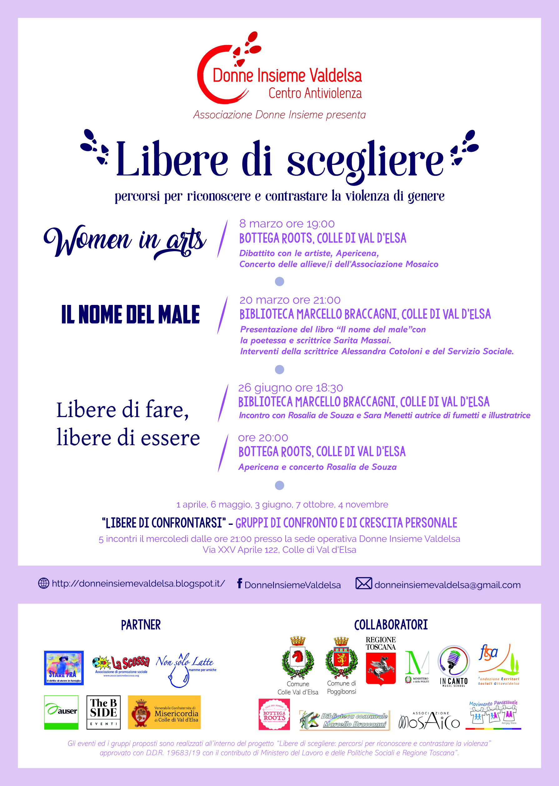 “Libere di scegliere” è un ciclo di eventi di sensibilizzazione organizzati dal Centro Antiviolenza Donne Insieme Valdelsa insieme a numerosi partner e collaboratori, al fine di riconoscere e contrastare la violenza di genere. Artiste, scrittrici, psicologhe, legali, nell'ambito di dibattiti e laboratori per spaziare dal gender gap alla vita di coppia.