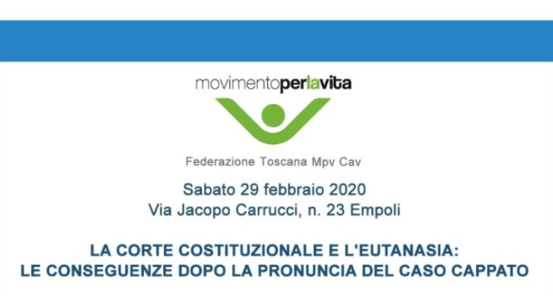 La Federazione Toscana Mpv e Cav organizza, per il prossimo 29 febbraio ad Empoli, una conferenza dal titolo: “La Corte Costituzionale e l’eutanasia: le conseguenze dopo la pronuncia del caso Cappato”. La Corte Costituzionale, lo scorso 25 settembre 2019, ha dichiarato la “non punibilità dell’aiuto al suicidio in presenza di determinate condizioni”, come risposta al procedimento penale a carico di Marco Cappato per il suicidio assistito di Fabiano Antoniani detto Dj Fabo, poi definitivamente assolto il 23 dicembre 2019 dalla Corte d’Assise di Milano.
