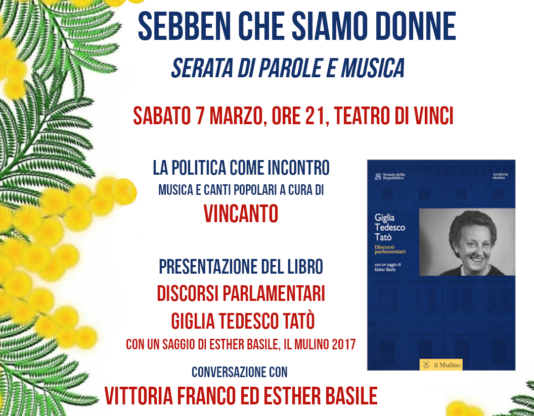 Sabato 7 marzo Esther Basile, studiosa dell'Istituto per gli Studi filosofici di Napoli che ha curato la pubblicazione dei discorsi parlamentari di Giglia Tedesco , sarà a Vinci insieme a Vittoria Franco, filosofa e anche lei senatrice della Repubblica dal 2001 al 2008, per parlare delle battaglie e delle attività di Giglia Tedesco, di come la politica possa essere dialogo e costruzione di diritti e opportunità.