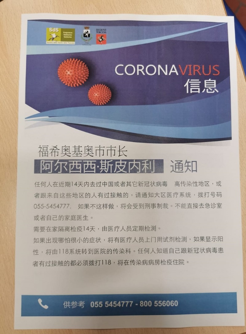 Prosegue a gran ritmo la campagna di informazione che il Comune di Fucecchio ha messo in campo per dare il maggior numero di indicazioni utili ai cittadini sul tema del Coronavirus. Questa mattina il sindaco Alessio Spinelli, insieme all'assessore allo sport Fabio Gargani e all'assessore al Palio Daniele Cei, ha incontrato il Cda dell'Associazione Palio e i presidenti delle 12 Contrade ai quali è stato consegnato ulteriore materiale informativo della Regione Toscana e del Ministero della Salute da esporre presso le proprie contrade. Un analogo incontro si è svolto nei giorni scorsi con l'assessore alle politiche sociali Emiliano Lazzeretti e alcune associazioni di volontariato. Un nuovo incontro, sempre con le associazioni, si terrà anche la prossima settimana. Intanto in questi giorni la campagna informativa prosegue anche direttamente verso i cittadini con un volantinaggio che coinvolge tutto il territorio e con l'invio postale a tutti i residenti stranieri dell'opuscolo informativo tradotto in cinese, inglese, francese e arabo. Un impegno fortemente voluto dal sindaco Alessio Spinelli, che anche nella veste di presidente della Società della Salute Empolese Valdarno Valdelsa, segue da vicino l'evolversi della situazione tenendosi in continuo contatto con i responsabili della Regione Toscana e dell'Asl Toscana Centro.