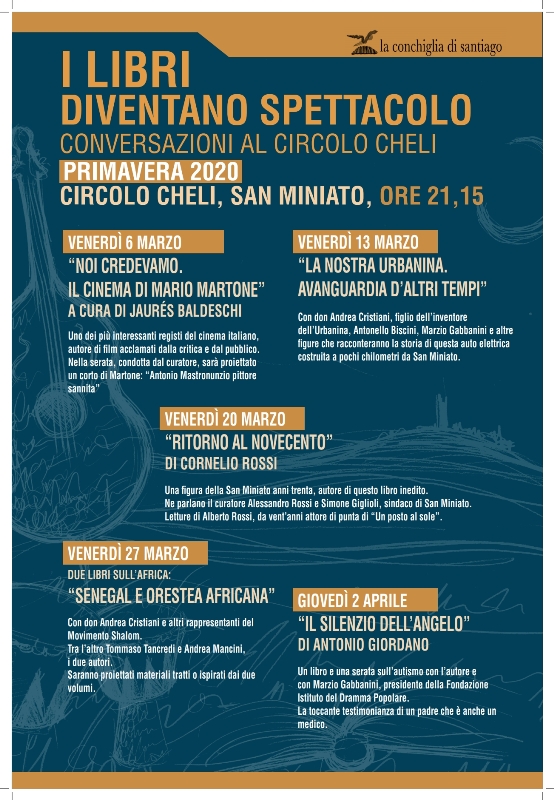 Continuano i “festeggiamenti” per il decennale di La conchiglia di Santiago, ancora con una serie di iniziative, spettacoli, presentazioni di libri, mostre. Ecco qui di seguito la stagione di primavera 2020 al Circolo Cheli di San Miniato, cinque interessantissime presentazioni, con le migliori forze culturali e artistiche non solo della zona, ma anche provenienti dal resto dell’Italia. Tra l’altro con la presenza di un bravo attore come Alberto Rossi, da vent’anni protagonista di “Un posto al sole”, che verrà a confermare le sue origini sanminiatesi: pronipote dell’autore del libro edito da La conchiglia di Santiago, Cornelio Rossi che era nato nella città della Rocca a fine 800.