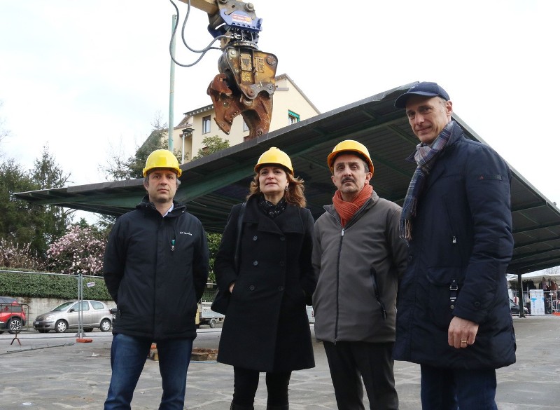 Avanti con i lavori di riqualificazione di piazza dell’Isolotto. Questa mattina è stata demolita la vecchia pensilina che lascerà posto alla nuova struttura, più ampia e funzionale nella nuova collocazione e nel disegno complessivo della piazza. A verificare l’andamento dei lavori sono stati il sindaco Dario Nardella e l’assessore ai Lavori pubblici Alessia Bettini nel corso di un sopralluogo con il presidente del Consiglio comunale Luca Milani, il presidente del Quartiere 4 Mirko Dormentoni e i tecnici impegnati nella riqualificazione.