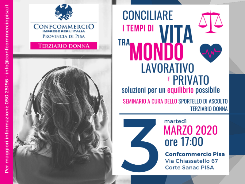 È possibile trovare un equilibrio tra lavoro e vita privata? Possiamo dedicarci con passione alla nostra professione senza perdere di vista i nostri interessi? A queste domande cercherà di rispondere “Conciliare i tempi di vita tra mondo lavorativo e privato: soluzioni per un equilibrio possibile” il seminario a cura dello Sportello di ascolto promosso dal Gruppo Terziario Donna di Confcommercio Provincia di Pisa che si terrà domani, martedì 3 marzo alle 17, presso la sede principale di Confcommercio Pisa, in via Chiassatello 67.