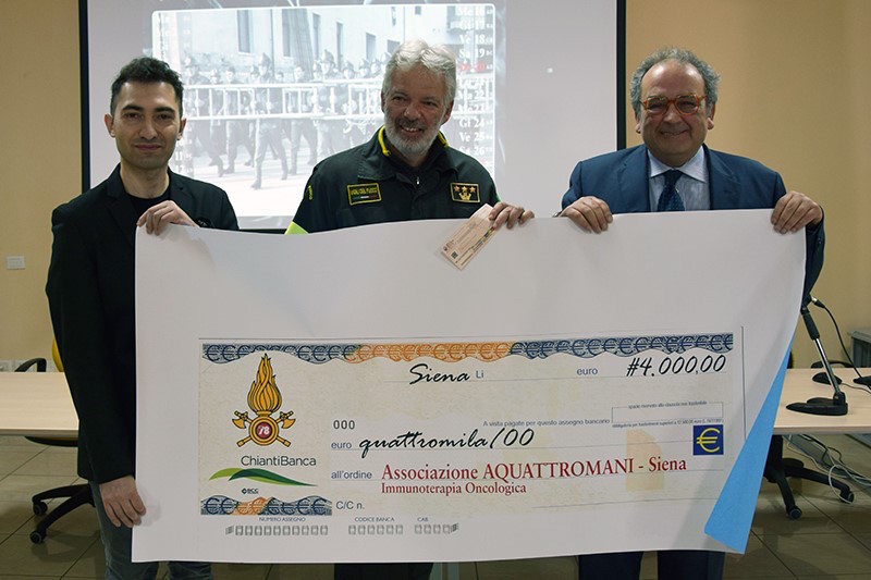 Un assegno da 4mila euro per testimoniare la vicinanza e la generosità dei Vigili del Fuoco di Siena al Centro di Immuno-Oncologia (CIO), diretto dal professor Michele Maio. È questo il significato della donazione effettuata dal Comando provinciale dei Vigili del Fuoco di Siena, grazie ad una raccolta fondi del personale della sede centrale e dei distaccamenti territoriali, tramite la vendita dei calendari 2020. I proventi di tale iniziativa benefica, 4mila euro per l’appunto, sono stati devoluti all’associazione Aquattromani che si occupa di supportare i pazienti della UOC Immunoterapia Oncologica dell’Azienda ospedaliero-universitaria Senese, diretta sempre dal professor Maio. Grazie a questo contributo, verranno acquistate delle nuove attrezzature multimediali da istallare nelle sale di attesa del CIO, dove trasmettere informazioni, video, interviste, schede tecniche e materiale divulgativo su terapie, stili di vita e contatti del Centro di Immuno-Oncologia di Siena.