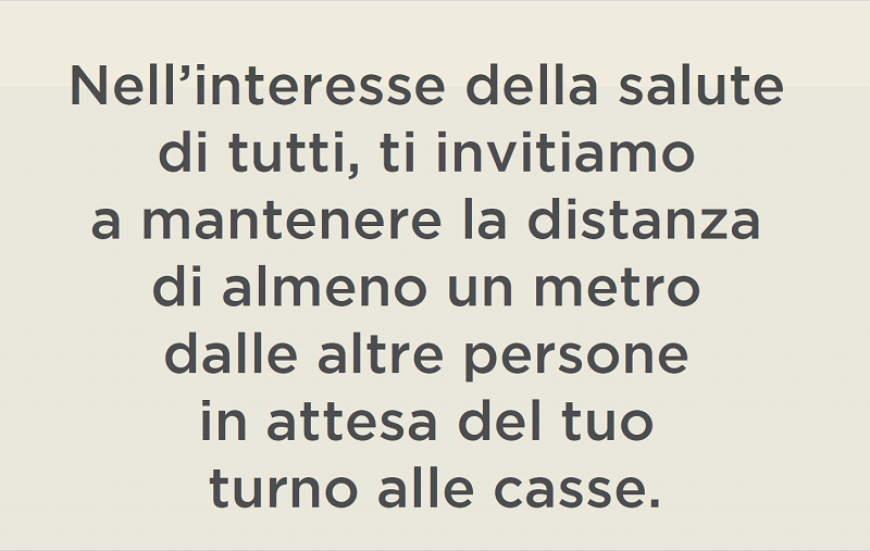 A questo proposito la Cooperativa ha elaborato un annuncio audio che ogni 30 minuti reciterà: “Nell’interesse della salute di tutti i nostri Soci, clienti e lavoratori, invitiamo la nostra gentile clientela a evitare affollamenti, con particolare attenzione ai banchi assistiti, alle casse e ai reparti più frequentati, mantenendo la distanza di almeno un metro dalle altre persone. È un gesto di prevenzione e di attenzione reciproca”.