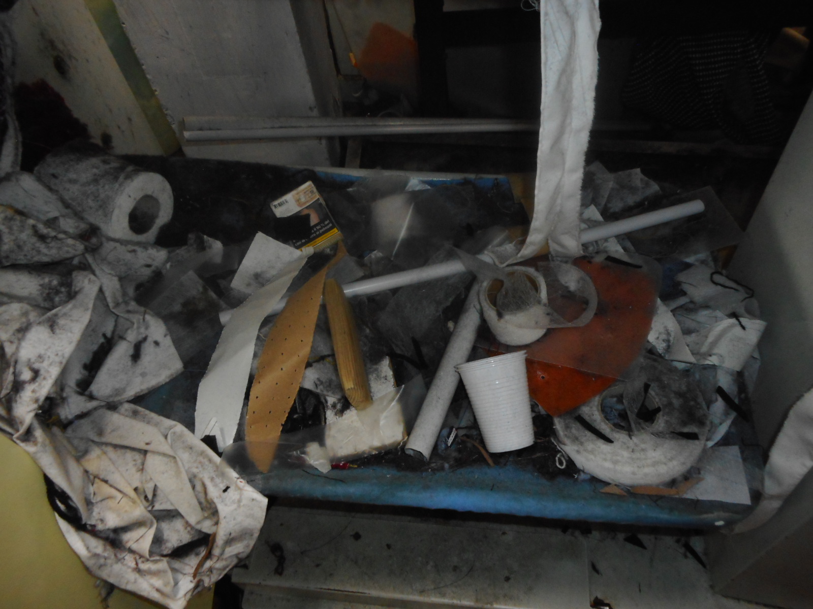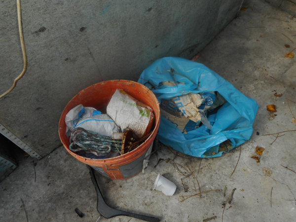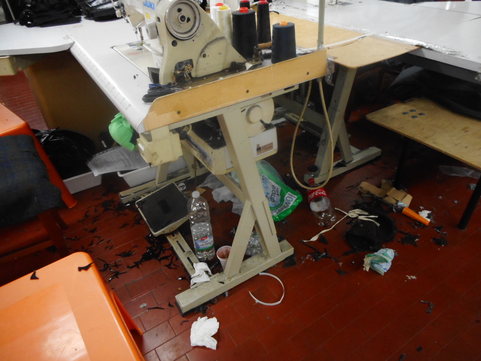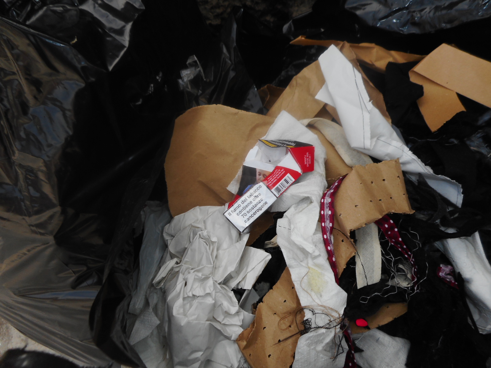 I sacchi neri accumulati all’ingresso del laboratorio contenevano ritagli di tessuto mescolati a rifiuti domestici come: bicchieri e bottiglie di plastica, lattine e contenitori di bevande ed alimenti, resti di cibi, mozziconi di sigaretta. Depositato alla rinfusa su una rampa di scale si trovava anche un ammasso di capi in tessuto non ancora finiti.
