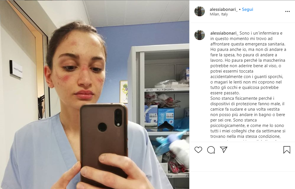 Ha fatto il giro dei social una foto scattata su Instagram da Alessia Bonari, infermiera di origini grossetane, 23 anni. Alessia è in Lombardia, nel cuore dell'emergenza coronavirus, a fare il proprio dovere. E dunque sul famoso social network l'ultimo scatto è molto diverso dai momenti felici in giro per l'Italia durante vacanze o brevi soggiorni. La foto la ritrae con vistosi arrossamenti sul volto, a causa di una mascherina indispensabile per lavorare ma comunque scomoda e irritante.