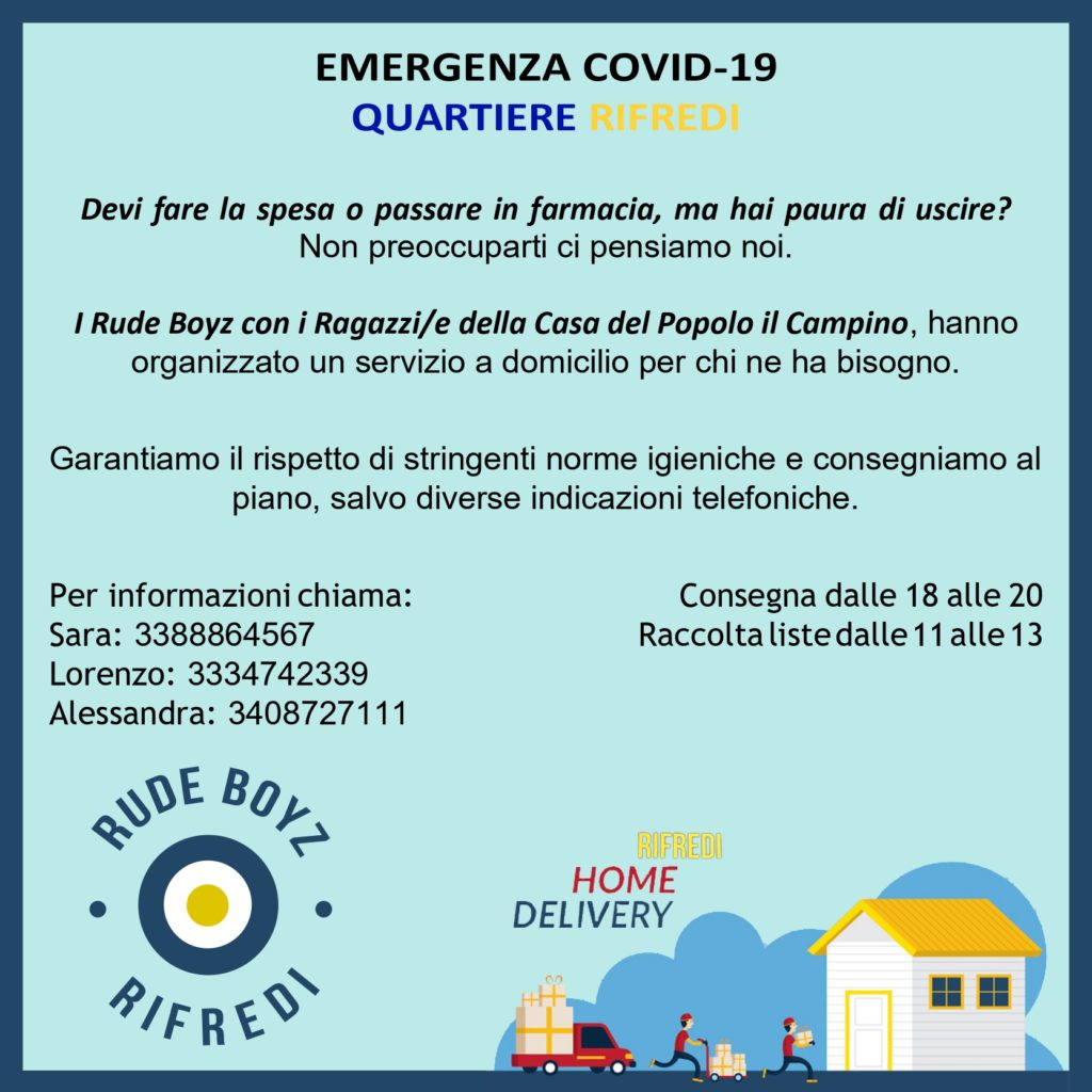 I Rude Boyz di Rifredi si sono organizzati insieme ai ragazzi e alle ragazze di Arci Circolo Le Panche - il Campino, per aiutare chi in questo momento di emergenza per il Covid-19, nel Quartiere Rifredi di Firenze, si sente più vulnerabile.