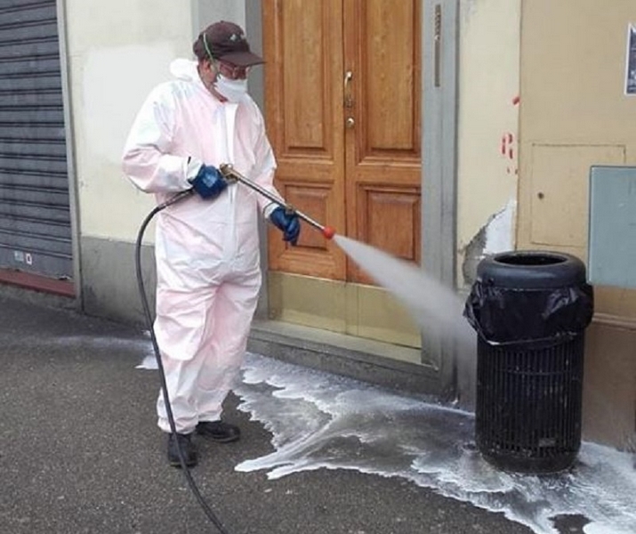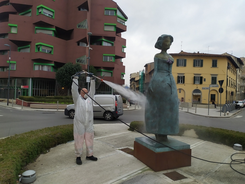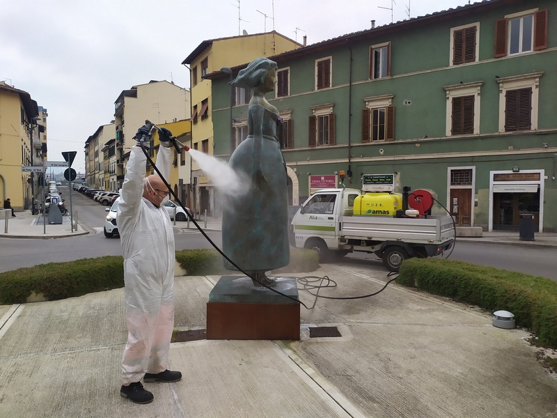 Al via la sanificazione straordinaria delle strade a Firenze per fronteggiare l'emergenza Coronavirus. Gli addetti al servizio di pulizia Alia, 'armati' di idranti con all'interno una soluzione di acqua e ipoclorito di sodio allo 0,1%, stanno percorrendo le strade deserte della città contribuendo a creare uno scenario a dir poco surreale. La sanificazione è un ulteriore arma per vincere la battaglia che l'intera città sta combattendo contro il Coronavirus, una misura che potrebbe ridurre la possibilità di contagio attraverso superfici potenzialmente infette.