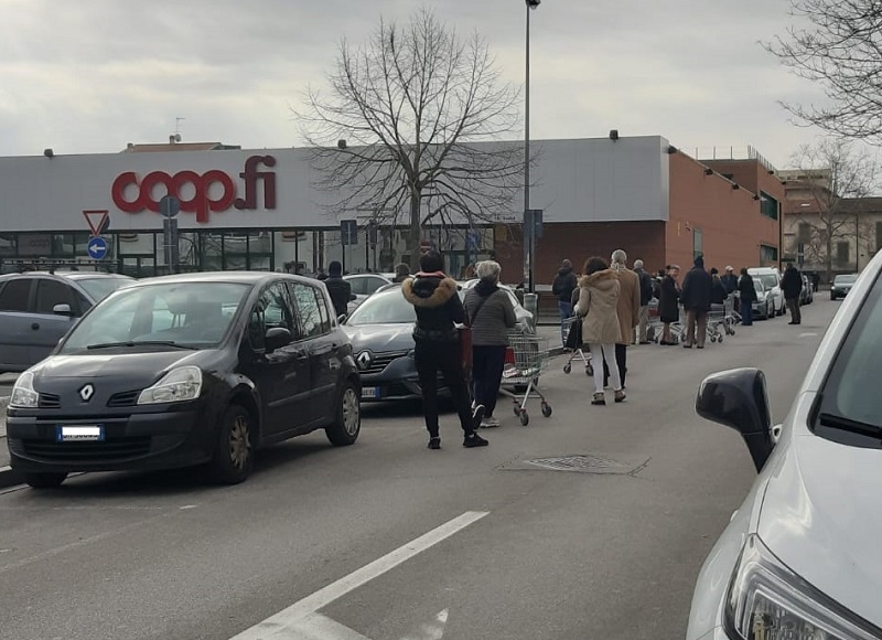 Da questa mattina lunghe file si stanno accalcando, ma a distanza di un metro, al di fuori dei supermercati toscani. Arrivano segnalazioni da tutto il territorio: lunghe code si registrano tra le altre a Firenze, Calenzano, Sesto Fiorentino e Empoli, come si vede dalle foto allegate. Probabilmente non sono state comprese a pieno le nuove disposizioni del governo per contrastare l'emergenza Coronavirus: con l'avvicinarsi del weekend pare che in tanti stiano facendo una corsa ai rifornimenti di cibo, forse pensando che i supermercati restino chiusi sabato e domenica.