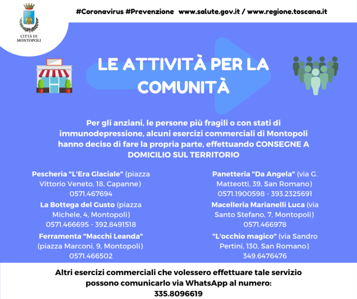 Nella gara di solidarietà per affrontare l’emergenza coronavirus scendono in campo anche alcuni negozi del tessuto commerciale del Comune di Montopoli. «In aggiunta all’iniziativa già lanciata dalla Protezione civile, che provvederà attraverso il volontariato alla consegna della spesa per casi particolari di isolamento o di impossibilità fisica, anche questi negozi contribuiranno a rendere un po’ più semplice la vita di alcuni concittadini – spiega l’assessore alle Attività produttive, Valerio Martinelli – un gesto per il quale li ringrazio, che ci inorgoglisce molto e che dimostra, ancora una volta, come la nostra sia una comunità con un forte senso di appartenenza e di solidarietà».