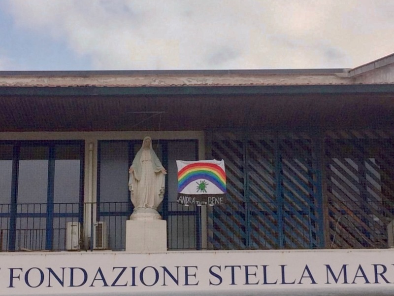 Un’opera collettiva realizzata da 7 ragazzi dell’Urgenza insieme ai loro educatori per incitare tutti alla fiducia, alla speranza, perché tutto andrà bene. Un’iniezione di positività che ha unito idealmente tutti i bambini e tutti i ragazzi d’Italia per incoraggiare tutti a stare tranquilli in questi giorni di emergenza. L’arcobaleno dei ragazzi e delle ragazze dell’Emergenza psichiatrica è stato posizionato sopra all’ingresso della sede originaria, proprio accanto alla Madonna “Stella del Mare”, perché con l’arcobaleno torna il sole.