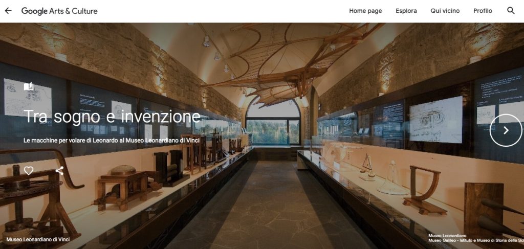 Tra i contenuti proposti, è possibile godere anche della video-storia “Tra sogno e invenzione. Le macchine per volare di Leonardo al Museo Leonardiano di Vinci”, realizzata per il progetto Google Arts&Culture “Tutto inizia da un'idea”, la più grande mostra online su invenzioni e scoperte mai curata prima. “Tra sogno e invenzione” permette di visitare, grazie a Google Street View, gli interni di alcune delle sale del percorso espositivo del Museo Leonardiano, della terrazza panoramica e una buona parte dei modelli esposti, corredati da didascalie e informazioni in italiano e in inglese.