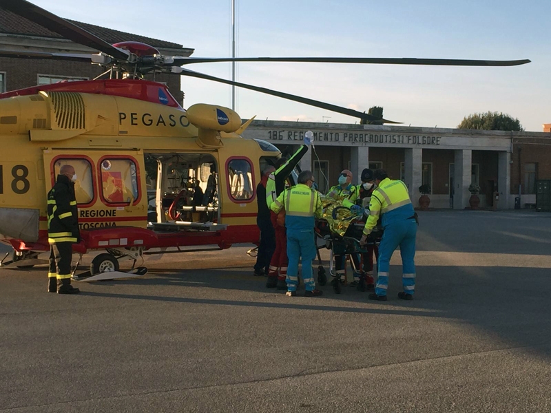 L’elicottero che ha trasportato il paziente è atterrato nel tardo pomeriggio presso la sede temporanea del servizio di elisoccorso presso la caserma “Roberto Bandini” del 186° Reggimento Paracadutisti “Folgore” di Siena.
