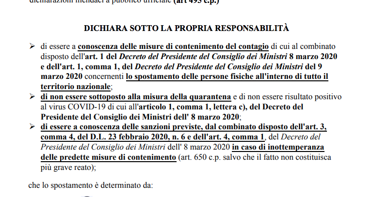 Nel nuovo modulo è presente una voce in cui l'interessato deve dichiarare di non trovarsi nelle condizioni previste dall'articolo 1, comma 1, lettera c, del decreto dell'8 marzo 2020. Il succitato articolo prescrive il divieto assoluto di "mobilità dalla propria abitazione o dimora per i soggetti sottoposti alla misura della quarantena ovvero risultati positivi al virus".