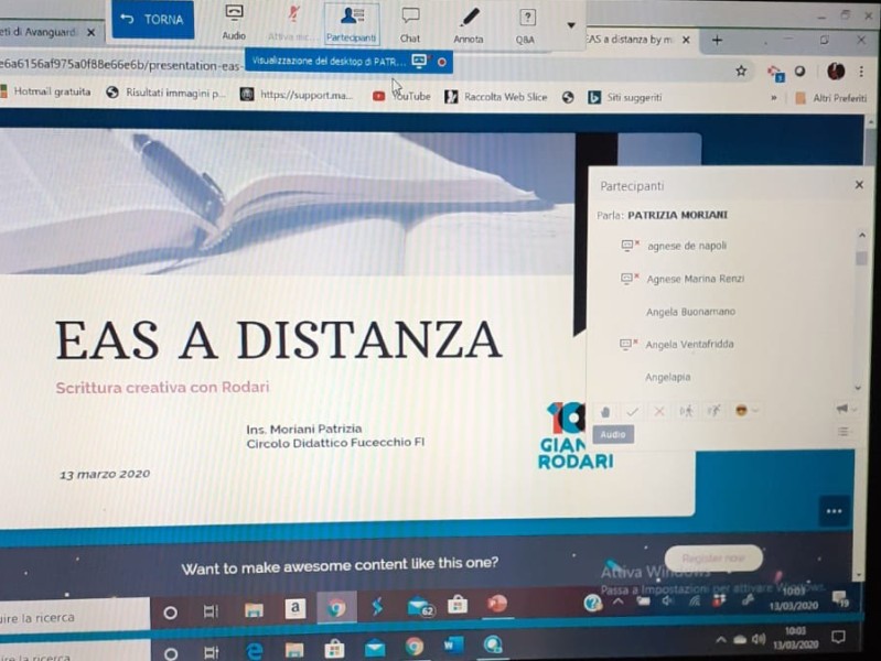 La docente, nel suo webinar di venerdì scorso dal titolo “EAS a distanza”, ha presentato la sua esperienza realizzata nella classe 3^ C del plesso “Carducci”, dimostrando come, anche con la didattica a distanza, si possa fare scuola in modo attivo e creativo sfruttando le tecnologie presenti nella scuola. L’intervento è visionabile qui: http://www.indire.it/la-rete-di-avanguardie-educative-a-supporto-dellemergenza-sanitaria/archivio-webinar/.