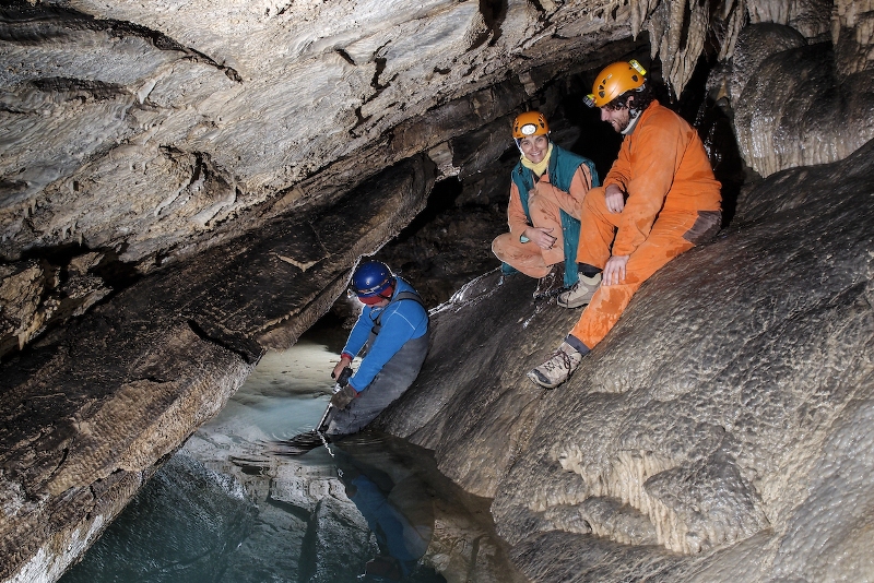 geologi dell’Università di Pisa e dell’Istituto nazionale di geofisica e vulcanologia a lavoro nelle viscere del Corchia, il primo da sinistra è il professore Giovanni Zanchetta
