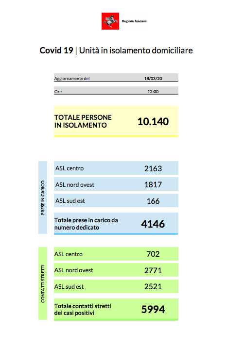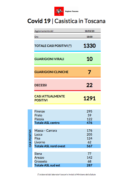Questi i numeri che fotografano la situazione toscana a mercoledì 18 marzo, così come sono stati trasmessi dall’assessorato al diritto alla salute al Ministero della salute, e comunicati dal capo della Protezione civile Angelo Borrelli.