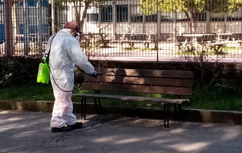 La sanificazione riguarda, sia nel capoluogo che nelle frazioni, pensiline degli autobus, panchine, fioriere, cestini, cassonetti stradali, giochi, ringhiere, sulle parti con cui possono venire a contatto le persone.