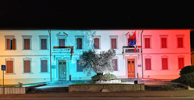 Ieri ricorrevano i 159 anni dall'Unità d'Italia e il sindaco Simone Calamai ha voluto illuminare il municipio con i colori del tricolore, un simbolo di speranza ma anche un forte richiamo alla responsabilità.