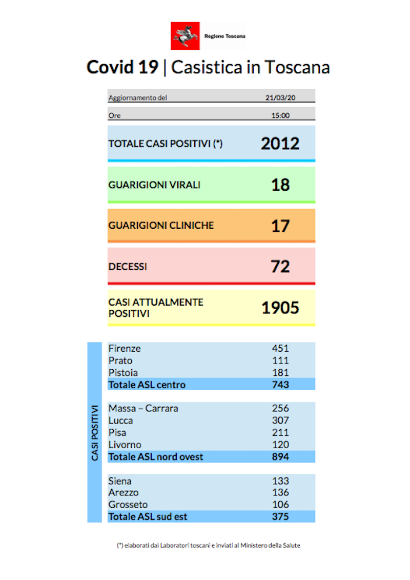 Dei 2012 tamponi risultati positivi questa è la suddivisione per provincia di segnalazione, che non sempre corrisponde necessariamente a quella di residenza: 451 Firenze, 181 Pistoia, 111 Prato (totale Asl centro: 743), 307 Lucca, 256 Massa-Carrara, 211 Pisa, 120 Livorno (totale Asl nord ovest: 894), 106 Grosseto, 133 Siena, 136 Arezzo (totale sud est: 375).