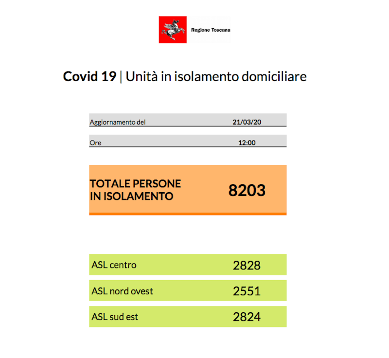Dal monitoraggio giornaliero sono invece 8.203 le persone in isolamento domiciliare in tutta la Toscana: 2.828 nella Asl centro, 2.551 nella Asl nord ovest, 2.824 nella Asl sud est.