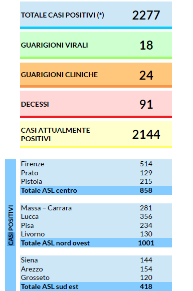 Dei 2277 tamponi risultati positivi questa è la suddivisione per provincia di segnalazione, che non sempre corrisponde necessariamente a quella di residenza: 514 Firenze, 215 Pistoia, 129 Prato (totale Asl centro: 858), 356 Lucca, 281 Massa-Carrara, 234 Pisa, 130 Livorno (totale Asl nord ovest: 1001), 120 Grosseto, 144 Siena, 154 Arezzo (totale sud est: 418).