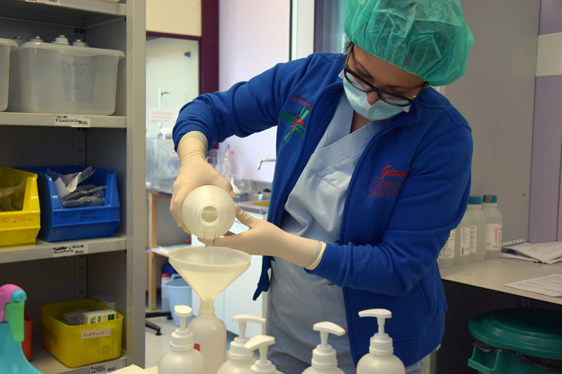 Alla produzione del gel ha collaborato anche l'Università di Siena, con il Dipartimento di Biotecnologie, Chimica e Farmacia del polo scientifico didattico di San Miniato che ha donato i componenti chimici per la preparazione del gel. «Abbiamo iniziato con piccoli quantitativi - aggiunge Giorgi - allo scopo di integrare le iniziali carenze del prodotto sul mercato, ma in queste settimane abbiamo assistito ad un incremento esponenziale della richiesta, fino ad arrivare alla preparazione di circa 50 chili al giorno necessari per le esigenze dell’ospedale».