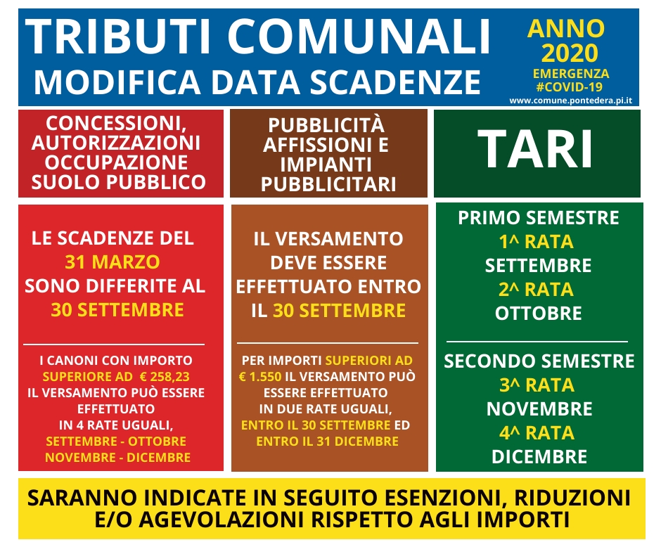 La Giunta Comunale di #Pontedera ha stabilito il differimento delle scadenze di alcuni tributi comunali nell'attesa di stabilire esenzioni, riduzioni e/o agevolazioni rispetto agli importi in considerazione dell’emergenza COVID-19