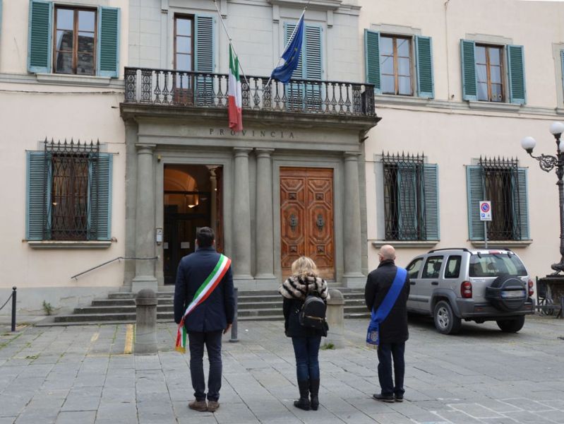 Il sindaco di Pistoia, Alessandro Tomasi, il presidente della provincia Luca Marmo e il vice prefetto vicario Carmela Crea hanno appena osservato un minuto di silenzio davanti al Palazzo della Provincia con le bandiere a mezz'asta.