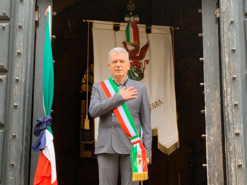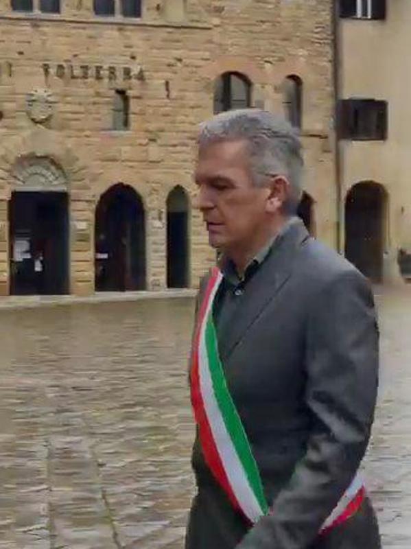 Bandiere a mezz’asta e un minuto di silenzio osservato dal Sindaco di Volterra Giacomo Santi, che ha attraversato una Piazza dei Priori silenziosa e deserta per raggiungere il Palazzo del Comune, in segno di lutto e di solidarietà.
