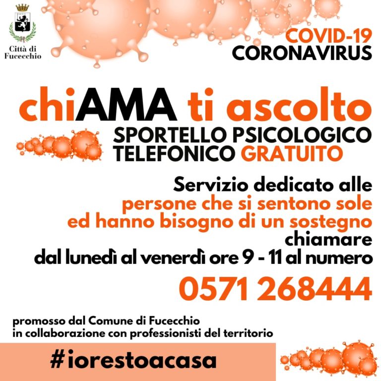 Partirà domani il servizio di sportello psicologico "ChiAMA, ti ascolto!", attivato dal Comune di Fucecchio grazie ad alcune professioniste volontarie. Dal lunedì al venerdì, dalle ore 9 alle 11, i cittadini potranno chiamare il numero telefonico 0571 268444 e trovare una persona esperta in grado di ascoltarli e supportarli in questo periodo di emergenza sanitaria che sta, chiaramente, provocando ansia, stress, paura o smarrimento. L'amministrazione comunale ringrazia le professioniste che si sono messe a disposizione per i nostri cittadini.