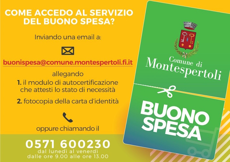 Il richiedente, una volta compilato il modello di autocertificazione, potrà inviarlo a buonispesa@comune.montespertoli.fi.it allegando fotocopia del documento d'identità. Verificato lo stato di necessità da parte del Comune in collaborazione con il servizio sociale, il cittadino avente diritto verrà contattato dal Comune per il ritiro dei buoni spesa, che potrà essere speso negli esercizi convenzionati. L’ammontare del contributo dei buoni spesa sarà calcolato sulla base del numero dei componenti del nucleo familiare e sarà, altresì, tenuto in considerazione il carico familiare (presenza di minori e disabili) e altri indicatori di disagio sociale dichiarati e rilevati.