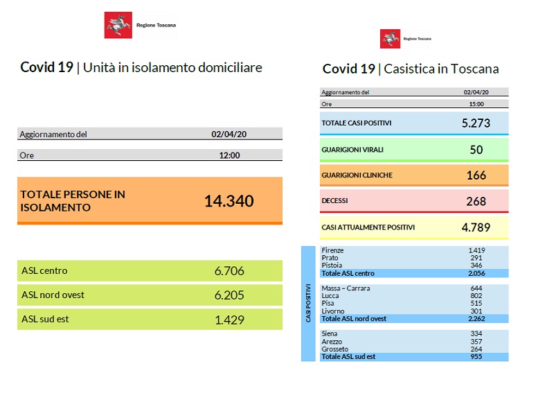 Questi i numeri che fotografano la situazione toscana a giovedì 2 aprile, così come sono stati trasmessi dall’assessorato al diritto alla salute al Ministero della salute, e come verranno comunicati dal capo della Protezione civile Angelo Borrelli.