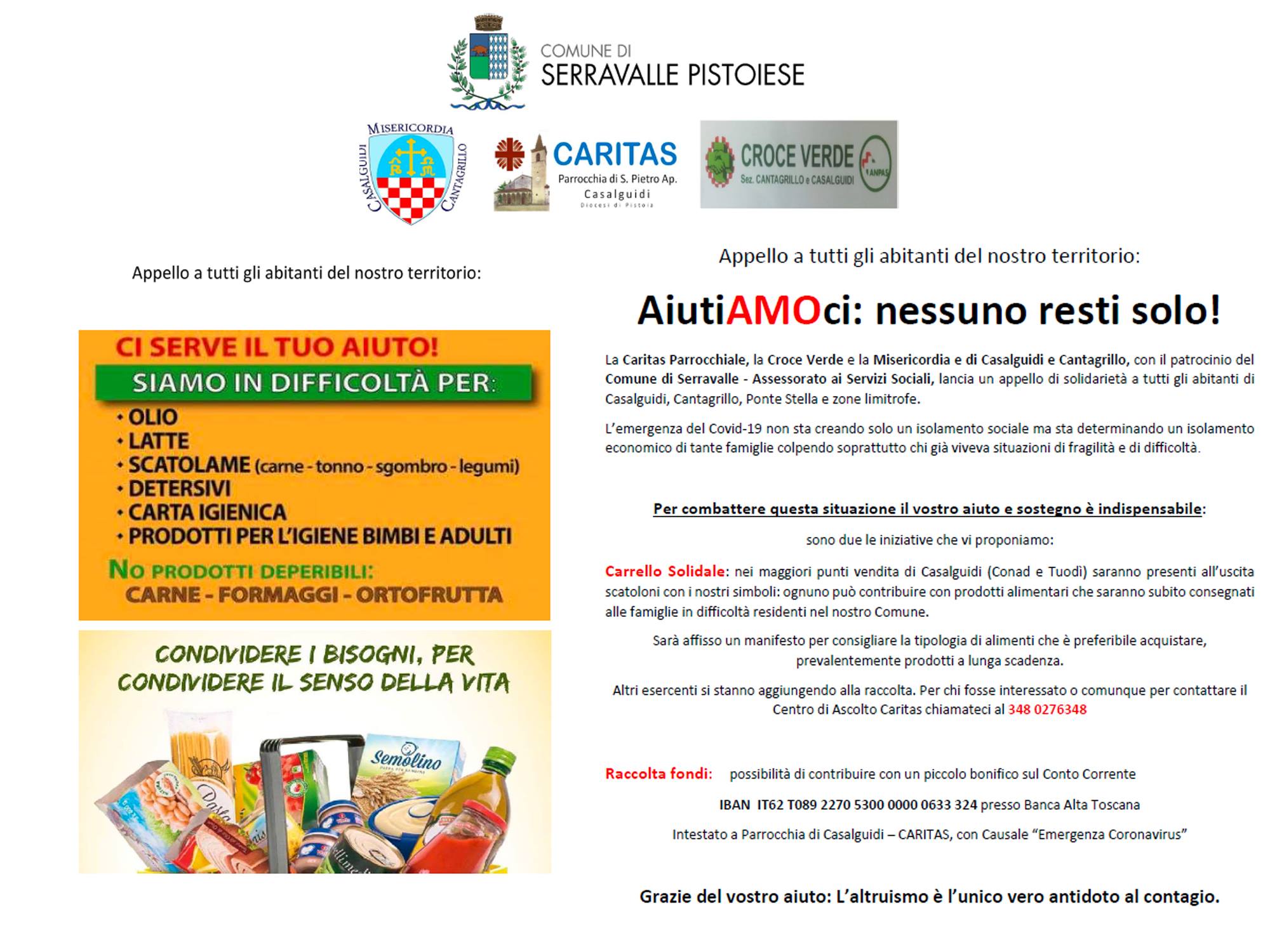 Carrello Solidale: nei maggiori punti vendita di Casalguidi (Conad e Tuodì) saranno presenti all’uscita scatoloni con i simboli della Caritas, ognuno può contribuire con prodotti alimentari che saranno subito consegnati alle famiglie in difficoltà residenti nel Comune. Sarà affisso un manifesto per consigliare la tipologia di alimenti che è preferibile acquistare, prevalentemente prodotti a lunga scadenza. Altri esercenti si stanno aggiungendo alla raccolta. Per chi fosse interessato o comunque per contattare il Centro di Ascolto Caritas può chiamare il numero: 348 0276348