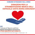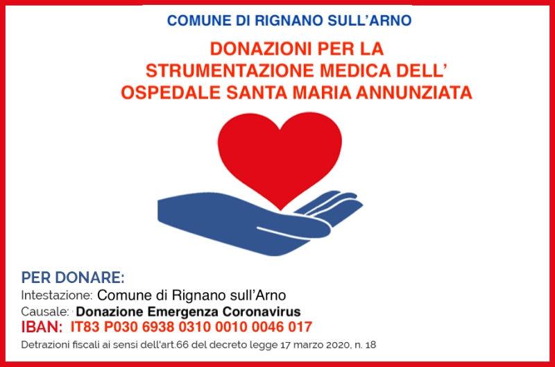 Riguardo all’emergenza sanitaria in corso si ricorda che, come previsto dal Decreto "Cura Italia", il Comune di Rignano sull’Arno ha deciso di mettere a disposizione il proprio conto corrente nel quale far confluire le donazioni di cittadini e aziende al fine di partecipare alla raccolta di fondi per l’acquisto di strumentazioni mediche a favore dell’Ospedale S. Maria Annunziata di Ponte a Niccheri. “Coraggio, abbiamo bisogno di tutti”, conclude il Sindaco, “per vincere questa battaglia e per dotare il nostro ospedale di strumenti indispensabili”.