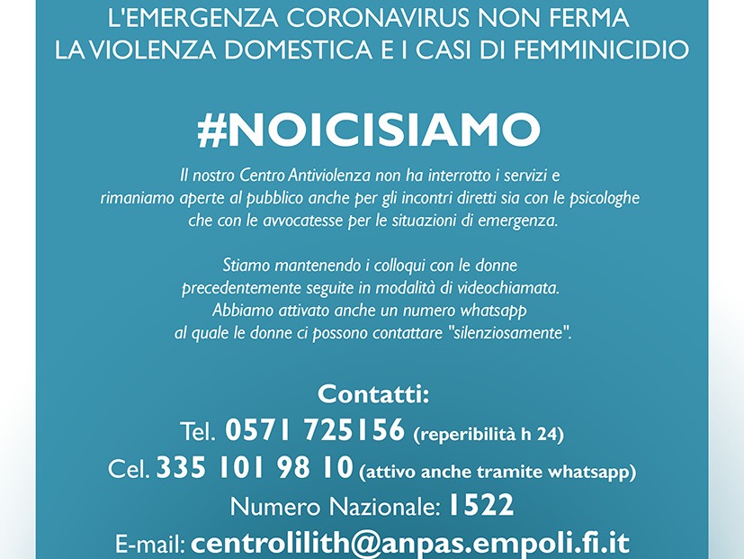 «In queste settimane difficili sono aumentati i casi di violenza nei confronti di donne e bambini. Mi rivolgo a tutte loro – dice l’assessore alle politiche sociali Valentina Torrini – non siete sole e non vi lasciamo sole! È attivo il nostro Centro Aiuto donna Lilith, gestito dalle Pubbliche Assistenze Riunite di Empoli. Una realtà di eccellenza, che non ha mai interrotto i servizi, cercando nuove soluzioni per aiutare le donne durante questa nuova e tremenda emergenza. Per continuare la nostra attività a fianco delle donne vittime della violenza maschile, abbiamo inserito sul nostro sito, nella sezione #IORESTOACASA, un pagina con tutti i servizi telefonici attivi sul territorio e i contatti utili, anche a livello nazionale».