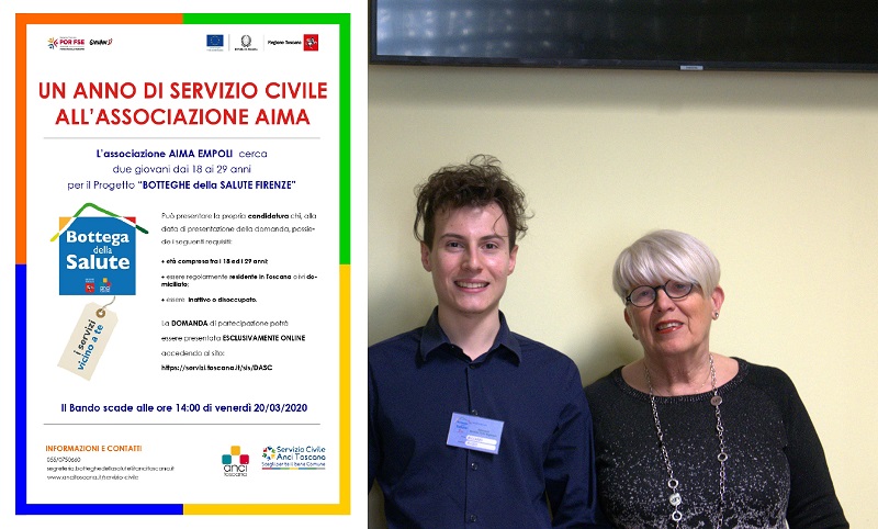 Per la nostra zona si cercano due volontari destinati per un anno alla “Bottega della Salute” di A.I.M.A. Empolese Valdelsa – Valdarno inferiore che saranno impegnati nell’erogazione gratuita di servizi connessi alla Tessera Sanitaria/Carta Nazionale dei Servizi, nell’offrire informazioni sulle prestazioni offerte alle persone affette da demenze e i loro familiari e sui servizi attivi in città per gli anziani grazie alle attività di Misericordia di Empoli, Pubblica Assistenza, Asl, Auser, Società della Salute.
