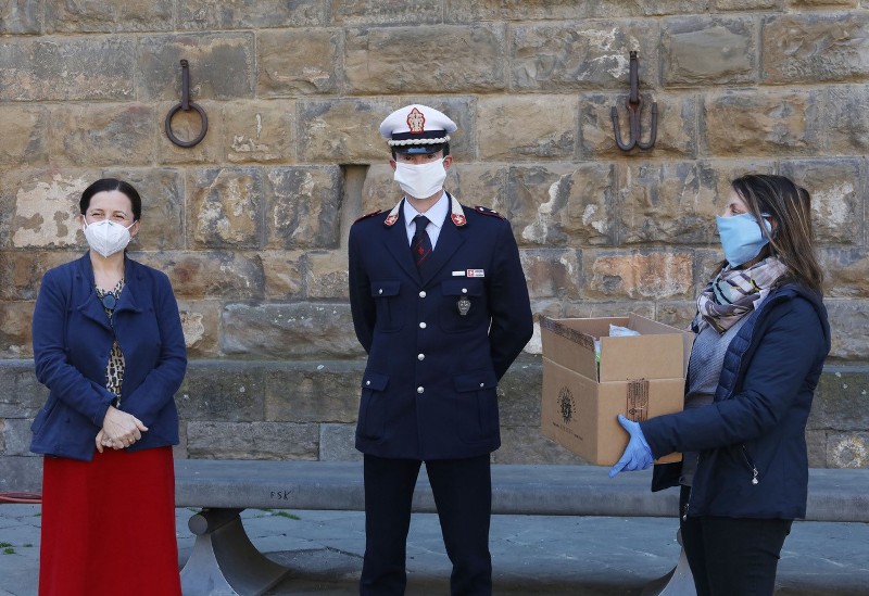 Alla consegna delle mascherine erano presenti la vicesindaca Cristina Giachi e la presidente della onlus Valentina Borgogni.