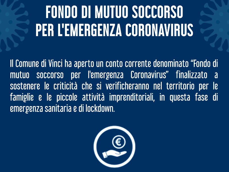 Il Comune di Vinci ha aperto un conto corrente denominato “Fondo di mutuo soccorso per l'emergenza Coronavirus” finalizzato a sostenere le famiglie e le piccole attività imprenditoriali, in questa fase di emergenza sanitaria e di lockdown.