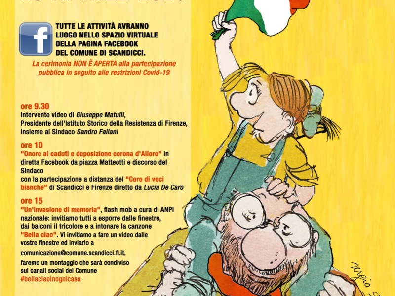 Alle 15 “Un invasione di memoria”, flash mob a cura di Anpi nazionale, con l’invito ai cittadini a esporre il tricolore dalle finestre e dai balconi di casa, e da lì intonare Bella Ciao; i partecipanti sono invitati a fare un video dalle finestre e a inviarlo a comunicazione@comune.scandicci.fi.it , per un montaggio collettivo che sarà condiviso sui canali social del Comune #bellaciaoinognicasa .