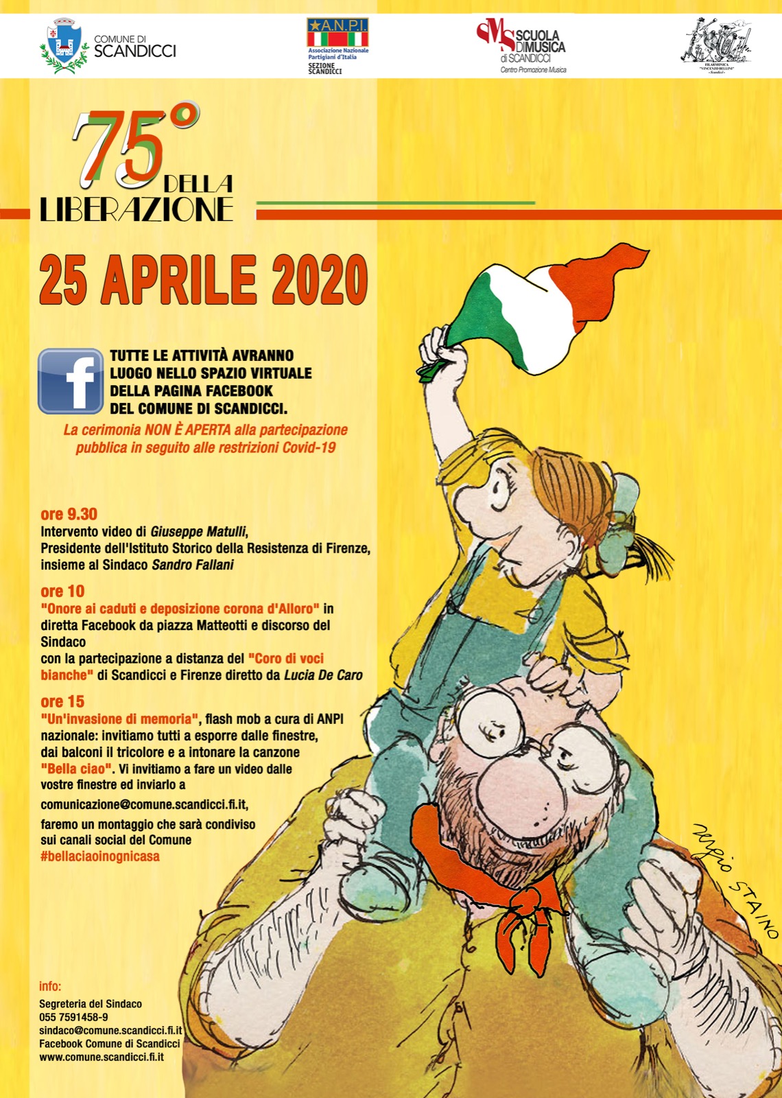 Sabato 25 aprile 2020 per il 75esimo Anniversario della Liberazione tutte le iniziative e le attività organizzate a Scandicci saranno online, e avranno luogo nello spazio virtuale della pagina Facebook del Comune di Scandicci; la cerimonia di onore ai caduti delle 10 non sarà quindi aperta al pubblico a seguito delle misure per l’emergenza sanitaria Covid 19, ma andrà in diretta sul canale fb del Comune con la partecipazione a distanza del Coro di voci bianche di Scandicci e di Firenze, e sarà anticipata alle 9,30 dall’intervento video del Presidente dell’Istituto Storico della Resistenza di Firenze Giuseppe Matulli assieme al Sindaco Sandro Fallani. Un incontro nel mondo reale, ma ben distanziati, è invece in programma alle 15 con il flash mob a cura dell’Associazione nazionale Partigiani d’Italia Anpi, con l’invito ai cittadini ad esporre i tricolori dai balconi e dalle finestre e a intonare Bella Ciao (ogni cittadino poi può inviare il proprio video a comunicazione@comune.scandicci.fi.it , per un montaggio collettivo che sarà pubblicato sui social del Comune #bellaciaoinognicasa ). Per info: Segreteria del Sindaco, 0557591.458/459, sindaco@comune.scandicci.fi.it .
